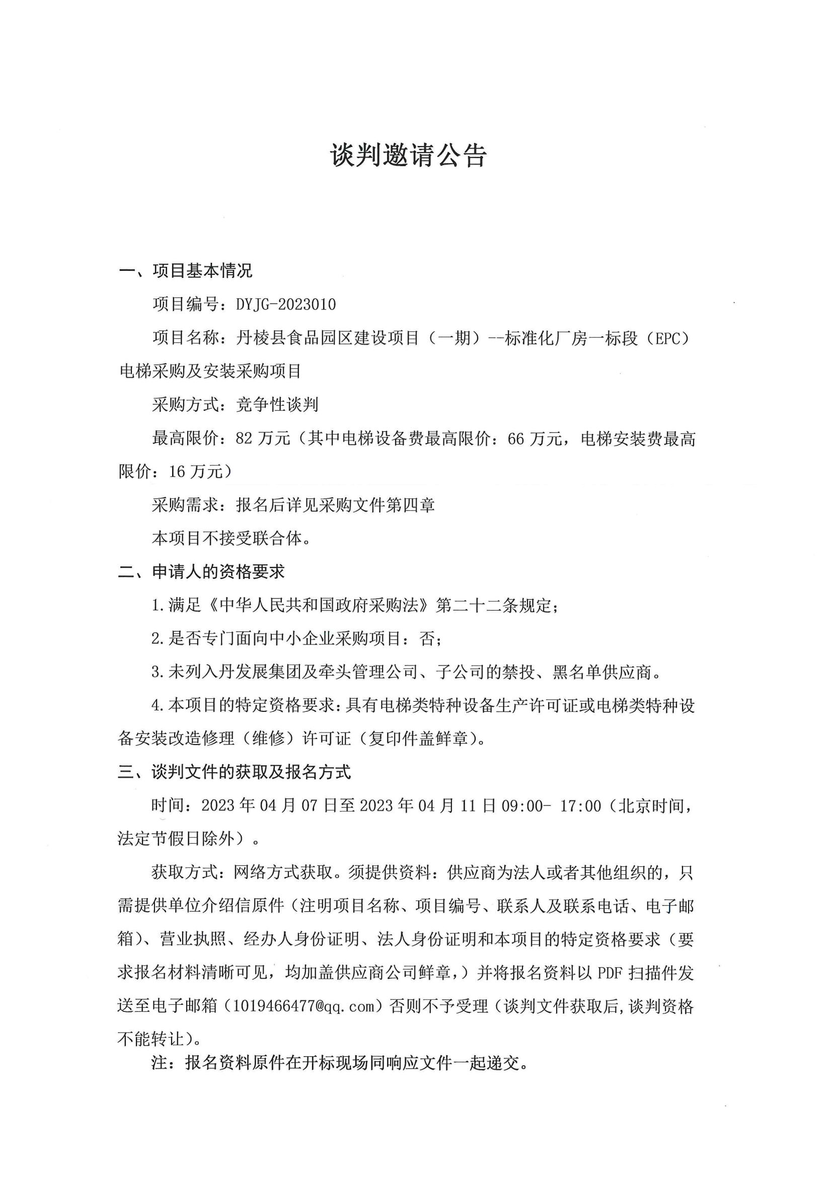 丹棱縣食品園區(qū)建設(shè)項(xiàng)目(一期)--標(biāo)準(zhǔn)化廠房一標(biāo)段(EPC)電梯采購(gòu)及安裝采購(gòu)項(xiàng)目談判邀請(qǐng)公告
