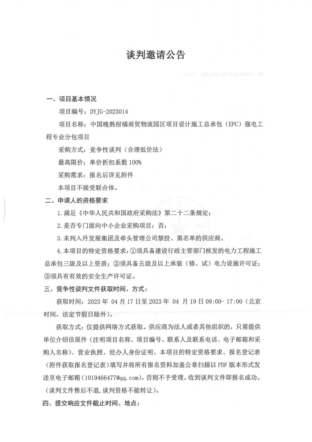 中國晚熟柑橘商貿(mào)物流園區(qū)項目設(shè)計施工總承包(EPC)強電工程專業(yè)分包項目談判邀請公告