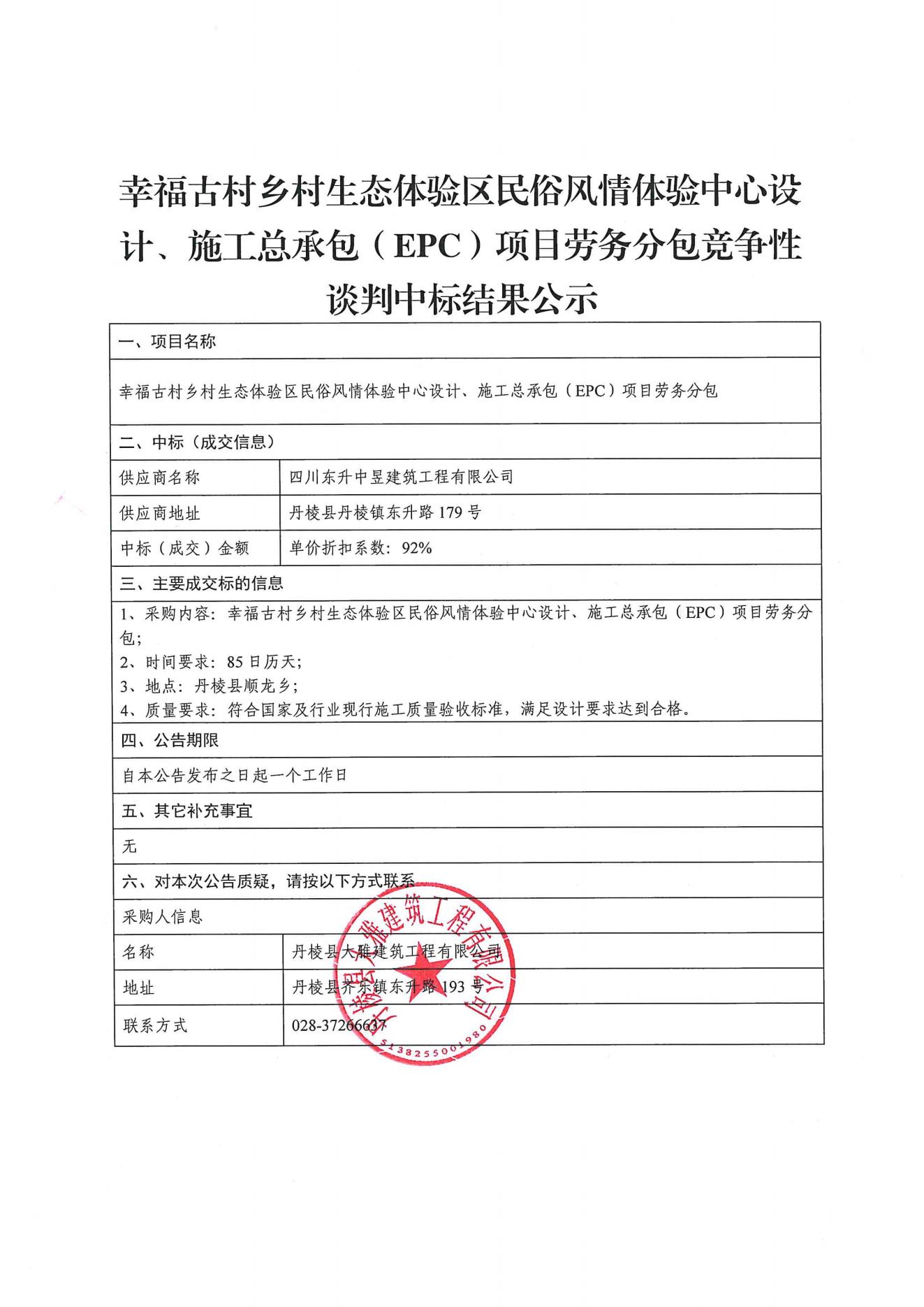 【大雅建筑公司】幸福古村鄉(xiāng)村生態(tài)體驗區(qū)民俗風(fēng)情體驗中心設(shè)計、施工總承包(EPC)項目勞務(wù)分包競爭性談判中標(biāo)結(jié)果公示