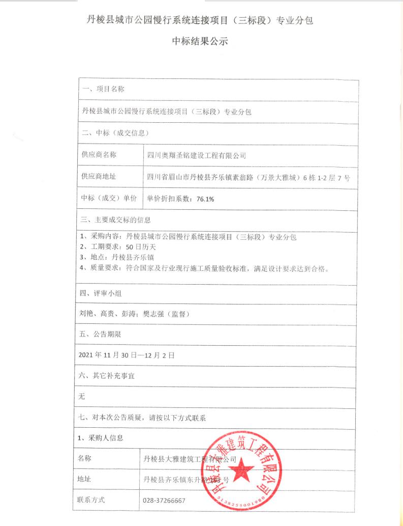【大雅建筑公司】丹棱縣城市公園慢行系統(tǒng)連接項(xiàng)目(三標(biāo)段)專業(yè)分包中標(biāo)結(jié)果公示