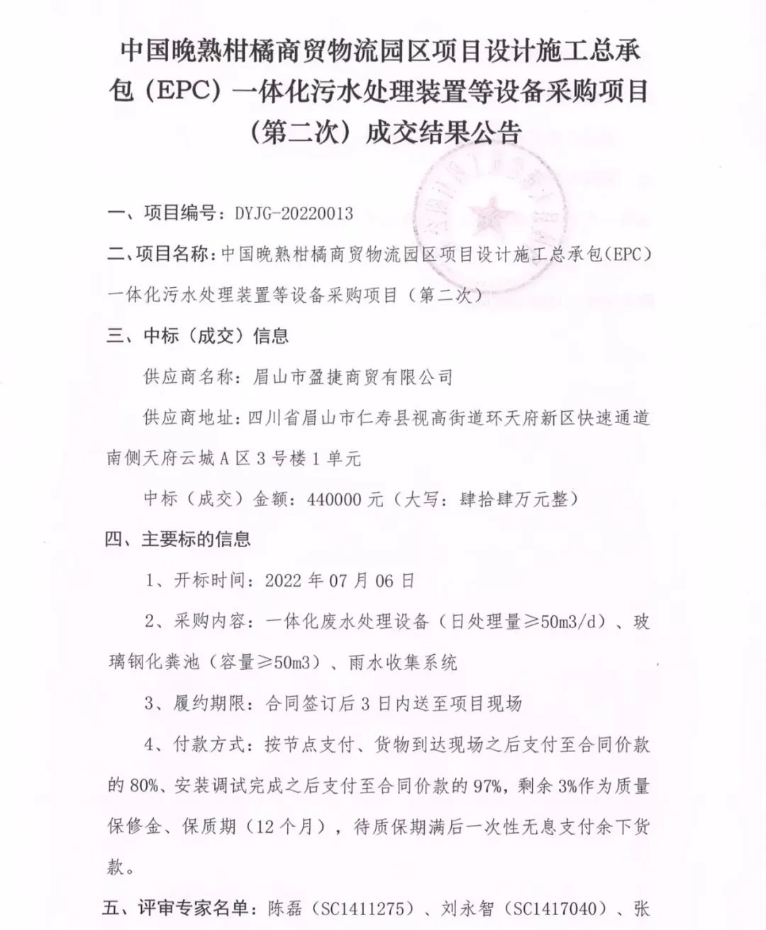 中國晚熟柑橘商貿(mào)物流園區(qū)項目設計施工總承包(EPC)一體化污水處理裝置等設備采購項目(第二次)成交結果公告