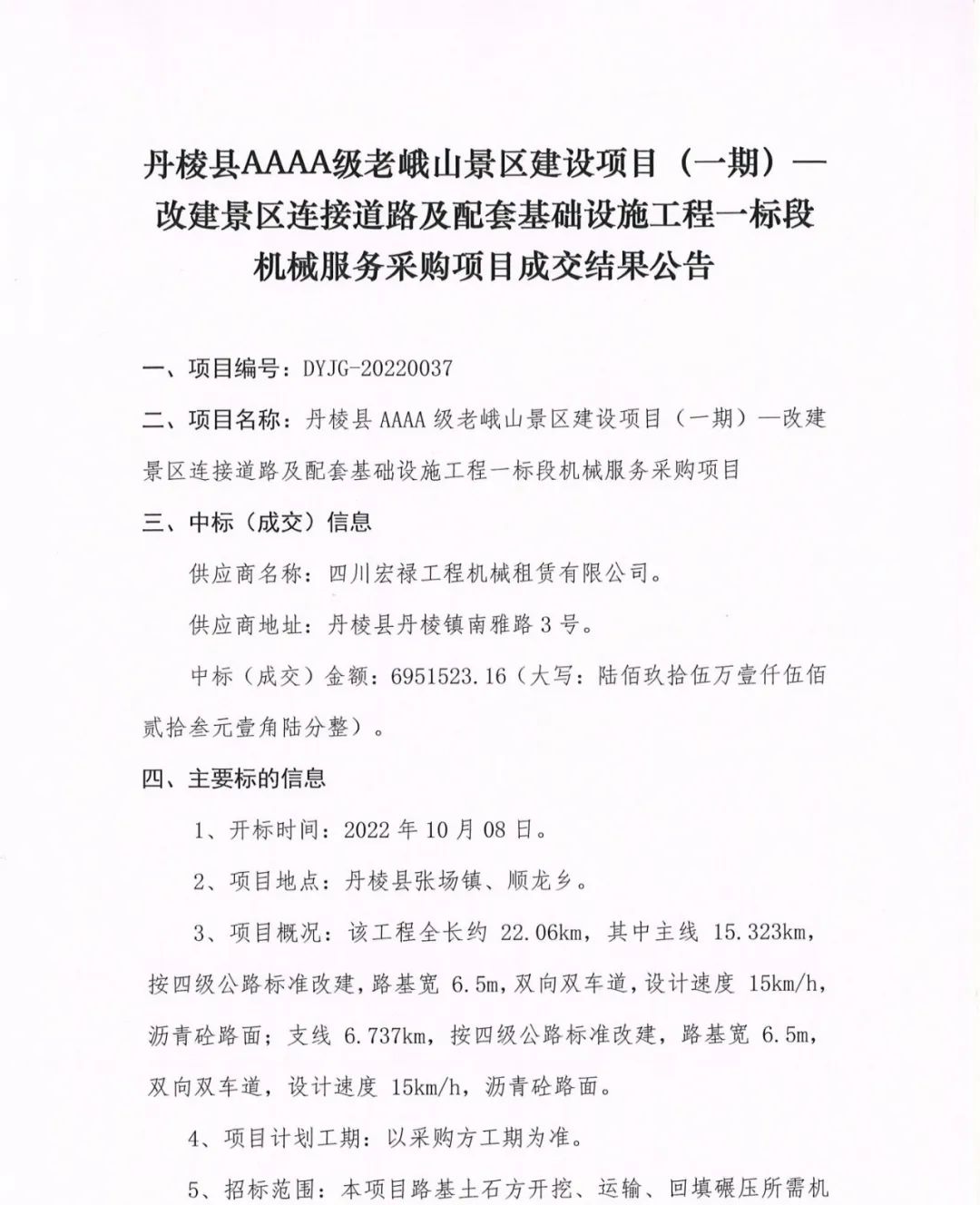 丹棱縣AAAA級老峨山景區(qū)建設項目(一期)--改建景區(qū)連接道路及配套基礎(chǔ)設施工程一標段機械服務采購項目成交結(jié)果公告