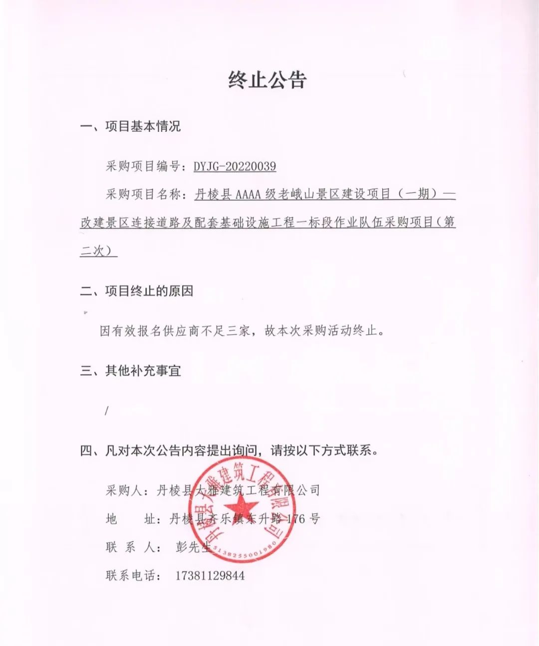 丹棱縣AAAA級老峨山景區(qū)建設項目(一期)--改建景區(qū)連接道路及配套基礎設施工程一標段作業(yè)隊伍采購項目(第二次)終止公告