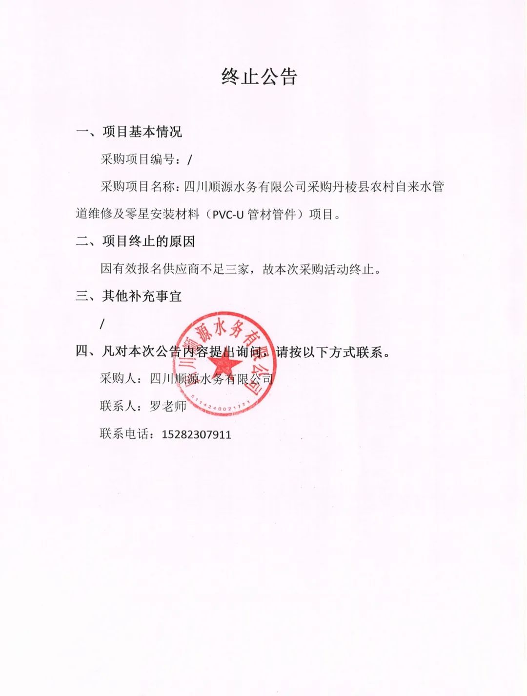 四川順源水務(wù)有限公司采購丹棱縣農(nóng)村自來水管道維修及零星安裝材料(PVC-U管材管件)項(xiàng)目終止公告